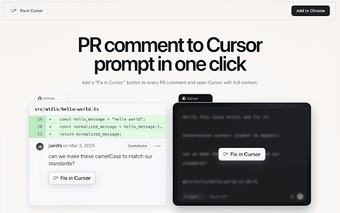 Fix in Cursor هو ملحق لمتصفح Chrome مصمم لتبسيط عملية مراجعات الشيفرة من خلال التكامل بسلاسة مع طلبات السحب. يضيف هذا الأداة زر "Fix in Cursor" المريح إلى كل تعليق على طلب السحب، مما يمكّن المطورين من إنشاء موجه Cursor سياقي بسرعة. مع نقرة واحدة فقط، يمكن للمستخدمين الوصول إلى التعليق وسياقه المحيط، مما يعزز كفاءة سير العمل أثناء مراجعات الشيفرة.